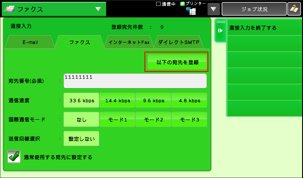 ⑦「通常使用する宛先に設定する」にチェックを入れ、[以下の宛先を登録]を押します。