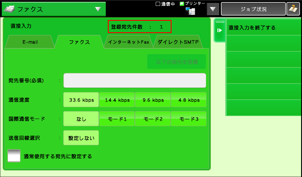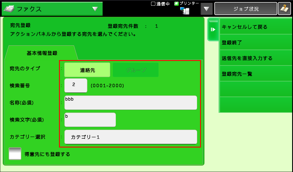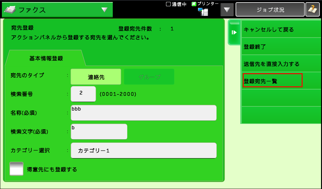 ⑧登録されると、「登録宛先件数」が1つ増え、「以下の宛先を登録」の文字が灰色になります。