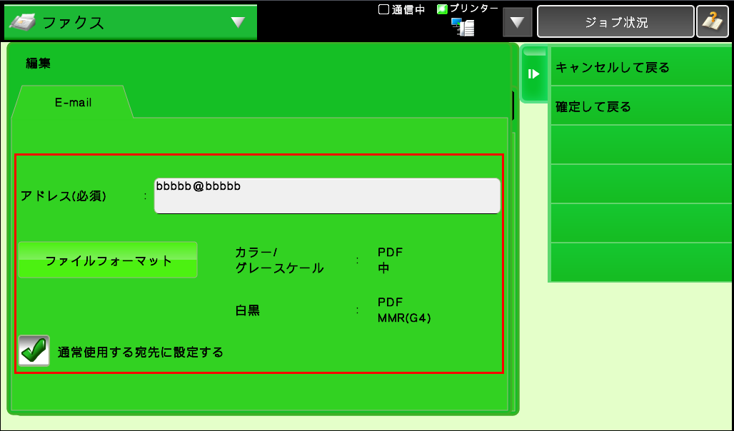 ⑧変更(例:bbb-eee@sharp.co.jp)が完了しましたら、アクションパネルの[確定して戻る]を押してください。