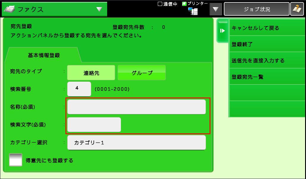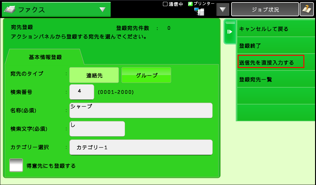 ⑤「名称(例:シャープ)」「検索文字(例:し)」が入力出来ましたら、アクションパネルの[送信先を直接入力する]を押してください。
