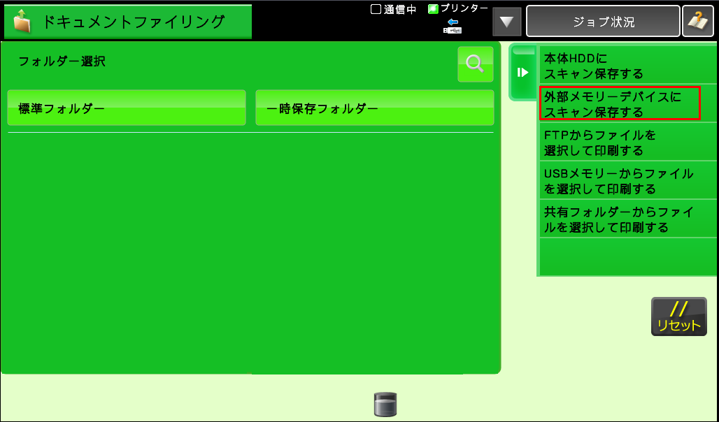 ④「フォルダ選択」画面が表示されますので、アクションパネルの[外部メモリーデバイスにスキャン保存する]を押してください。