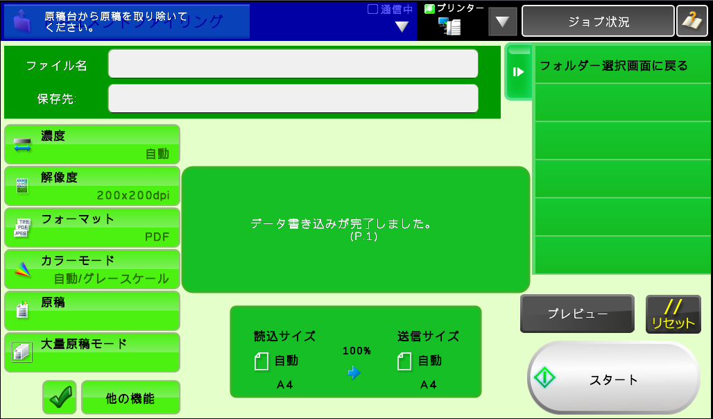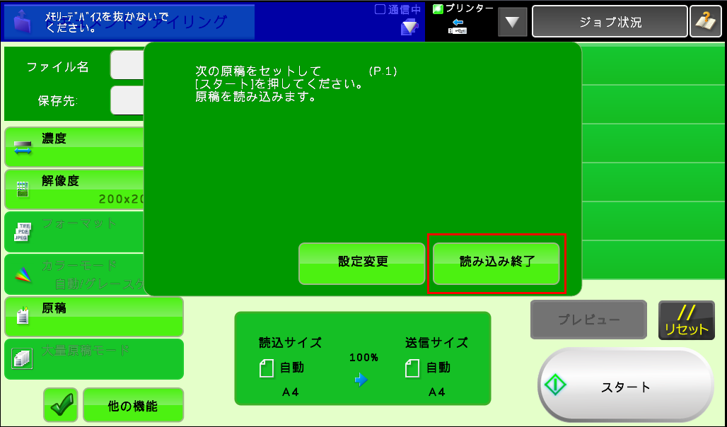 ⑥「次の原稿をセットして[スタート]を押してください。原稿を読み込みます。」が表示されますので、次の原稿がある場合は原稿を入れ替えて[スタート]を押してください。次の原稿が無い場合は[読み込み終了]を押してください。