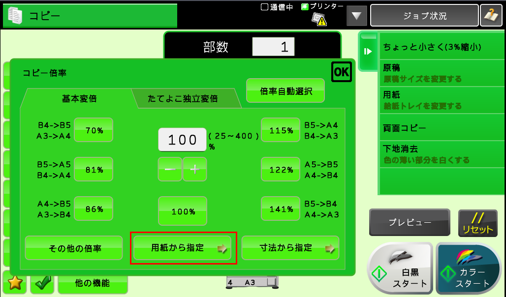 ④「コピー倍率」画面が表示されますので、[用紙から指定]を押してください。