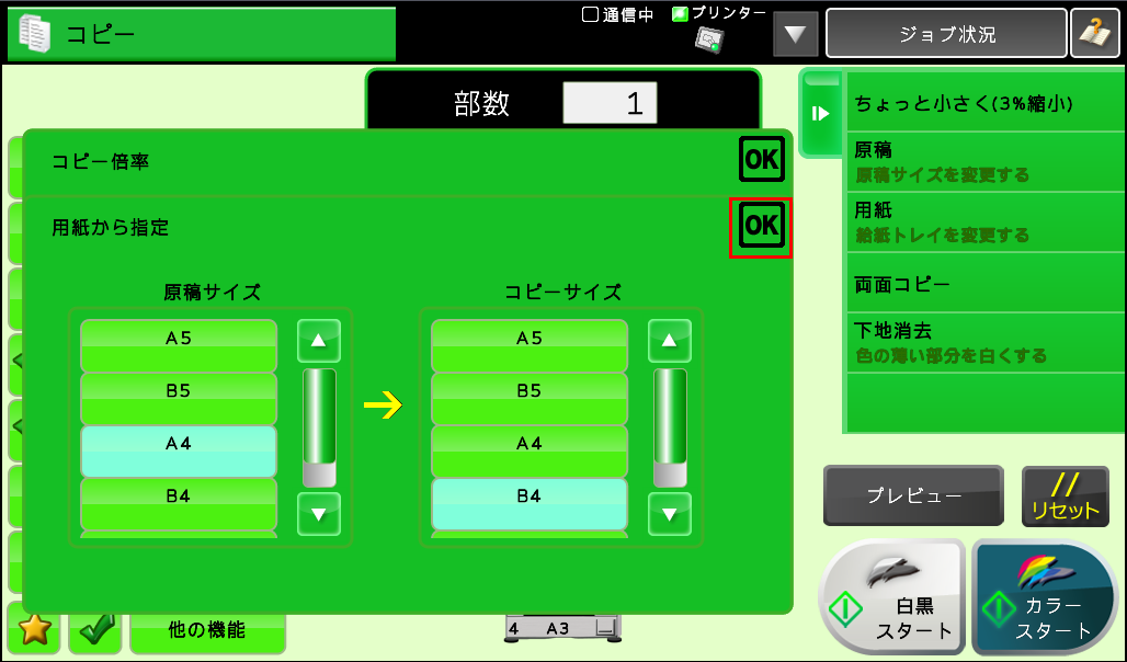 ⑤「用紙から指定」画面が表示されますので、コピーしたい用紙サイズ(例:B4 普通紙)を選択し、[OK]を押してください。