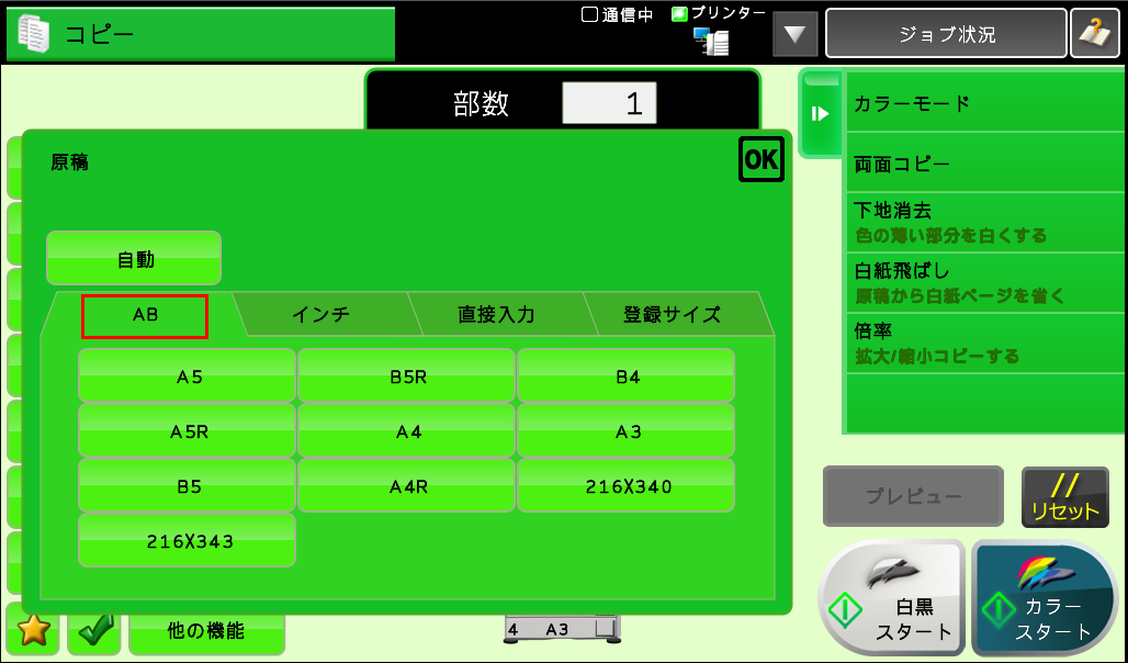 [AB]を押し、指定したい原稿サイズを設定後、[OK]を押してください。