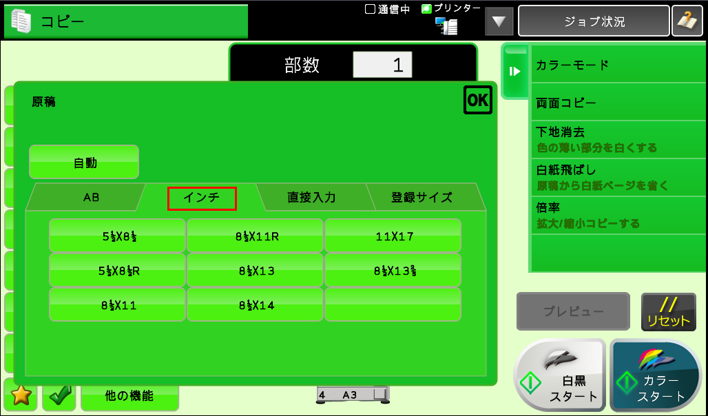 [インチ]を押し、指定したい原稿サイズを設定後、[OK]を押してください。