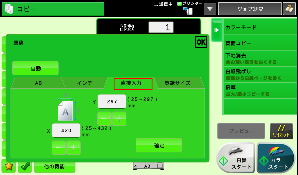 ① [直接入力]を押し、原稿サイズを設定後、[OK]を押してください。