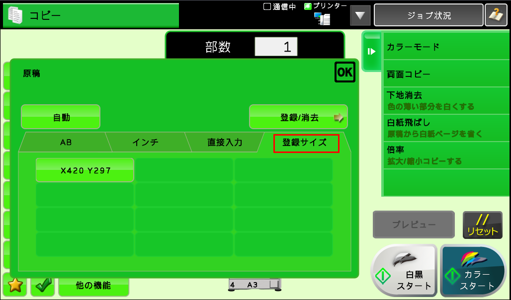 ① [登録サイズ]押し、原稿サイズを選択後、[OK]を押してください。
