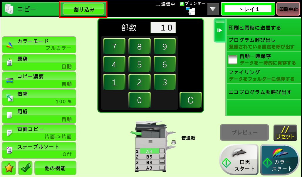 コピー基本画面の[割り込み]を押すと、簡単に割り込みコピーができます。