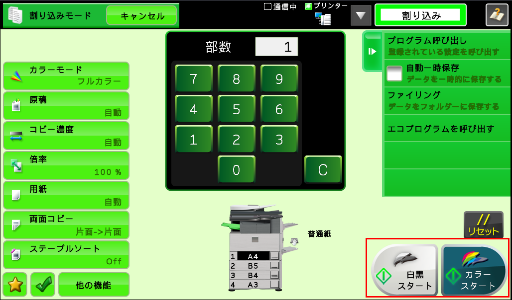 ③「割り込みモード」画面が表示されますので、コピー設定をしてください。