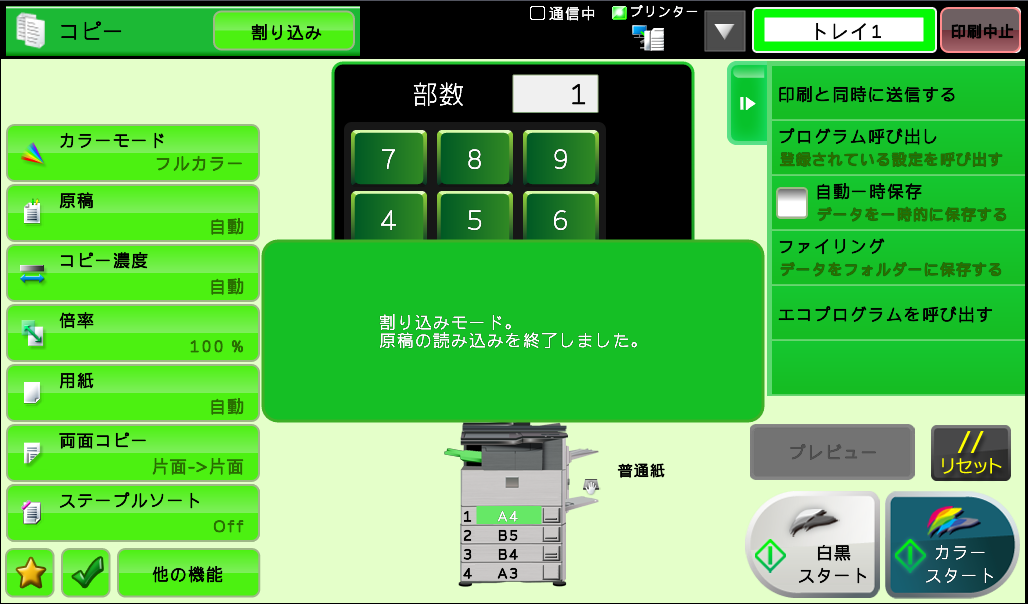 ※割り込みコピーのプリントが完了後、中断していたプリントが再開されます。