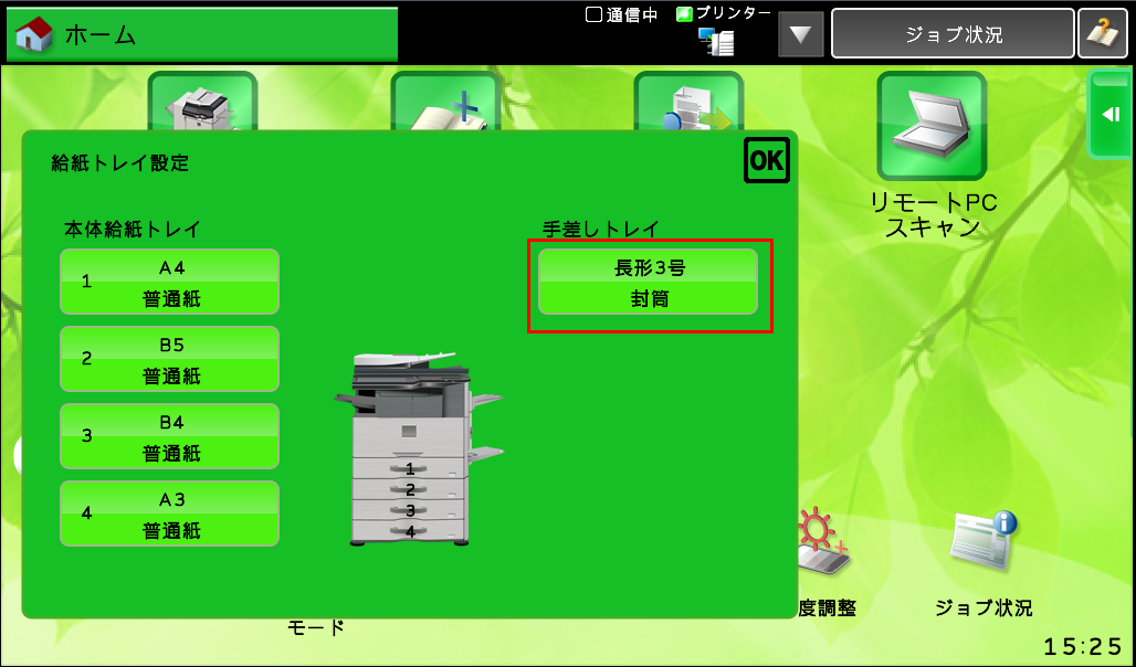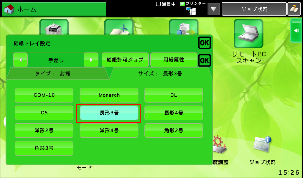 ③「手差しトレイ」が、下図のように表示されている場合は、[OK]押し、手順⑦へ進んでください。表示されていない場合は手順④へ進んでください。(例:長形3号)