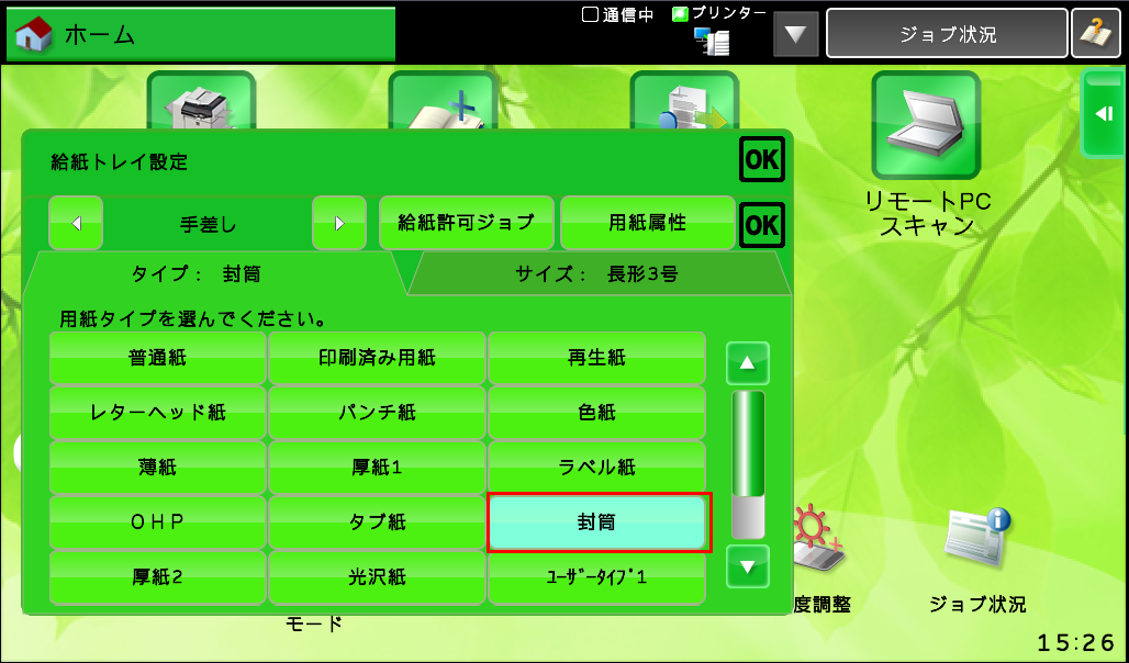 封筒に印刷するには、「給紙トレイ設定」画面で用紙タイプを「封筒」に設定して印刷します。