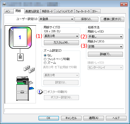 ⑦次にプリンタードライバーの設定画面で [用紙]タブを選択し、下記の機能を設定してください。