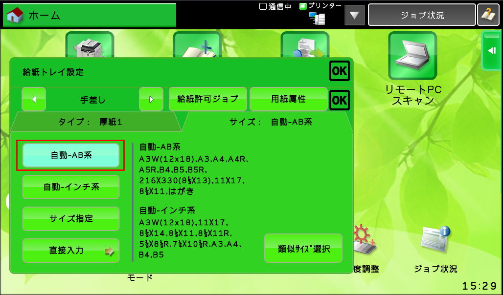 ④「タイプ」より、ご使用になる印刷用紙にあわせ、[厚紙1]/[厚紙2]から選択してください。