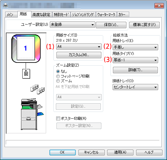 (設定例:用紙サイズ「A4」、用紙タイプ「厚紙-1」)