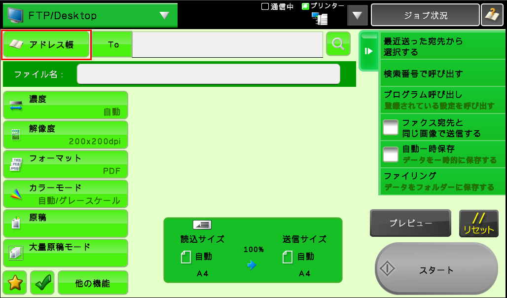 ③[FTP/Desktop]画面が表示されますので、[アドレス帳]を押してください。