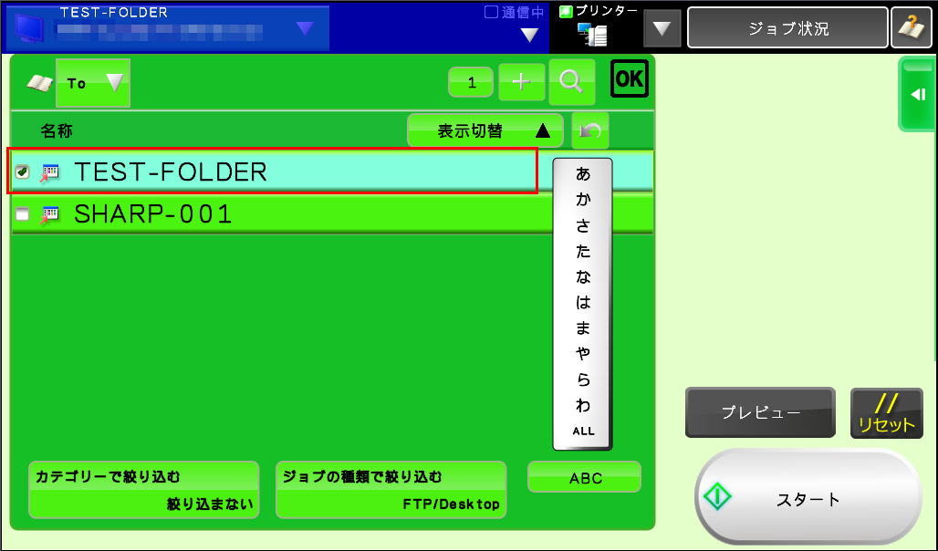 ④送信したいアドレスが含まれている連絡先(例:TEST-FOLDER)を押し、[OK]を押してください。