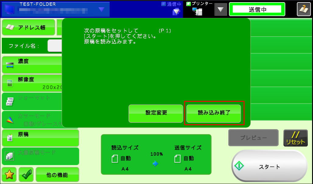 ⑥「次の原稿をセットして[スタート]を押してください。原稿を読み込みます。」が表示されますので、次の原稿がある場合は原稿を入れ替えて[スタート]を押してください。次の原稿が無い場合は[読み込み終了]を押してください。