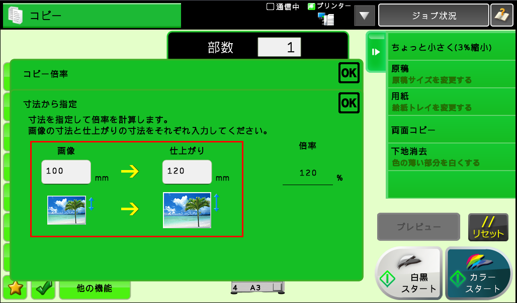 原稿サイズと用紙サイズが決まっている場合、画像寸法指定により倍率を設定することができます。