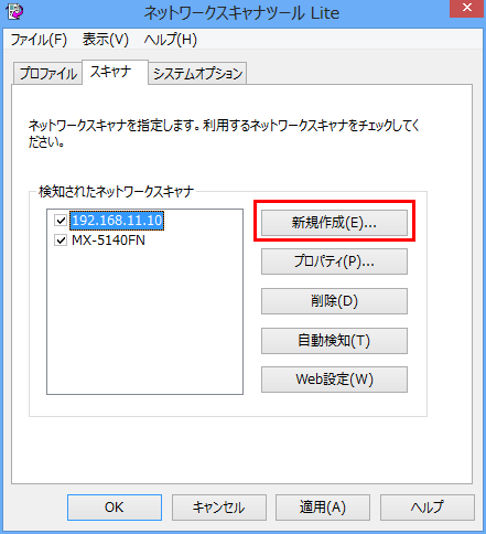 ネットワークスキャナーを手動で新規登録するには、「ネットワークスキャナーツール Lite」の「スキャナー」画面で[新規作成(E)]を押します。