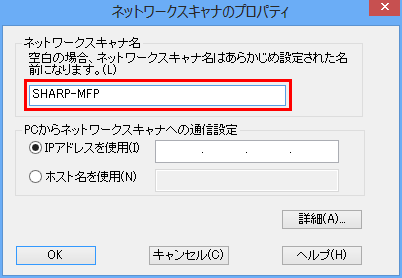 ④「ネットワークスキャナーのプロパティ」画面が表示されますので、「ネットワークスキャナー名」(例:SHARP-MFP)を入力してください。