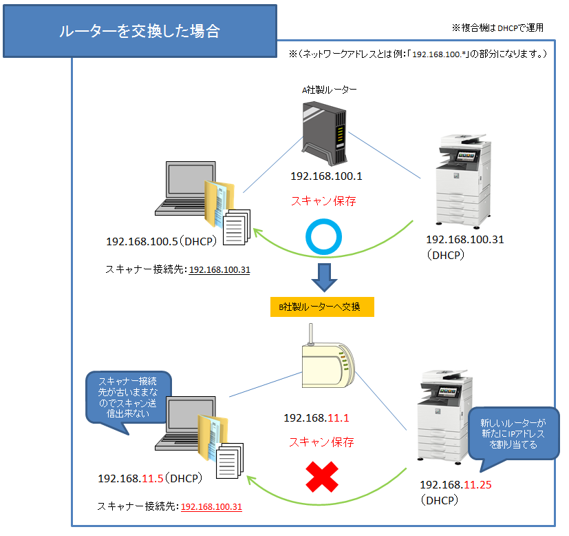 以前使用していたルーターとは違うメーカーのものを使用した場合は、以前とは違うネットワークアドレスを割り当てるケースがよくあります。パソコンと複合機には交換したルーターから新しいIPアドレスが配布(設定)されますので、「パソコン」と複合機の通信ができない事象が発生する場合があります。