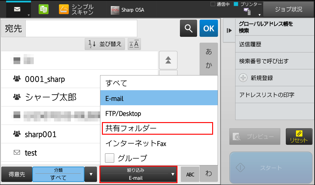 ②「アドレス帳」画面が表示されますので、[絞り込み]を押し[共有フォルダー]を押して下さい。
