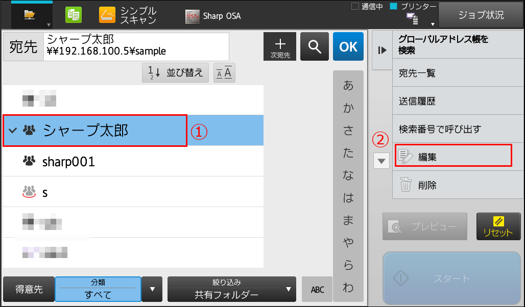 ③「共有フォルダー」の宛先を登録したアドレス帳が表示されますので、送信したい連絡先(例:シャープ太郎)を押し、[編集]を押して下さい。