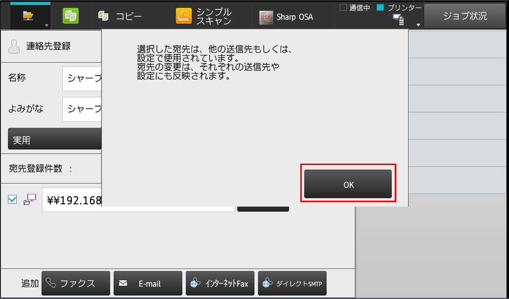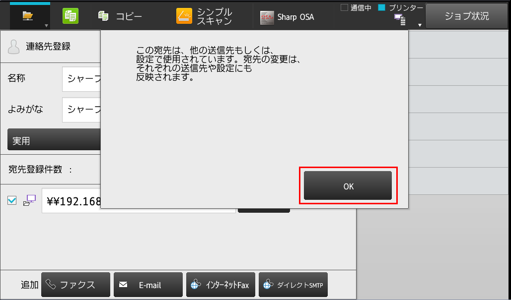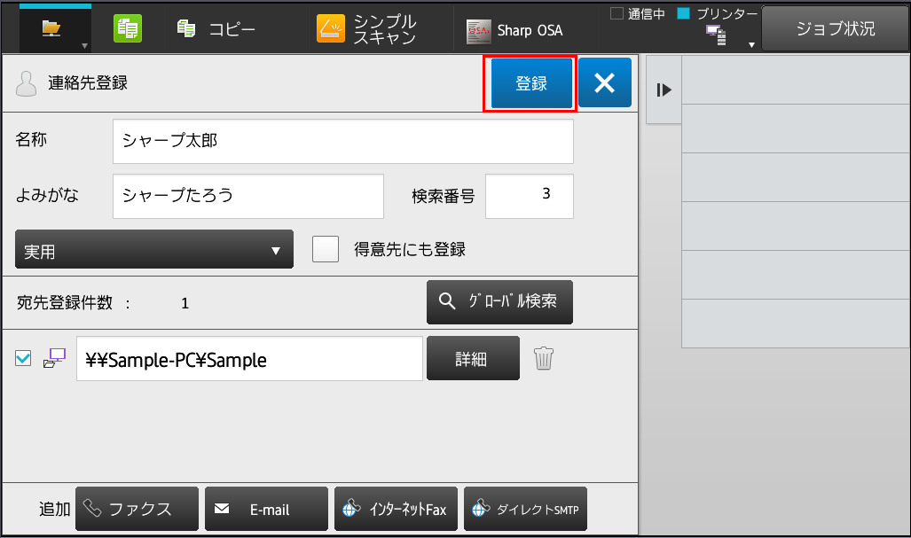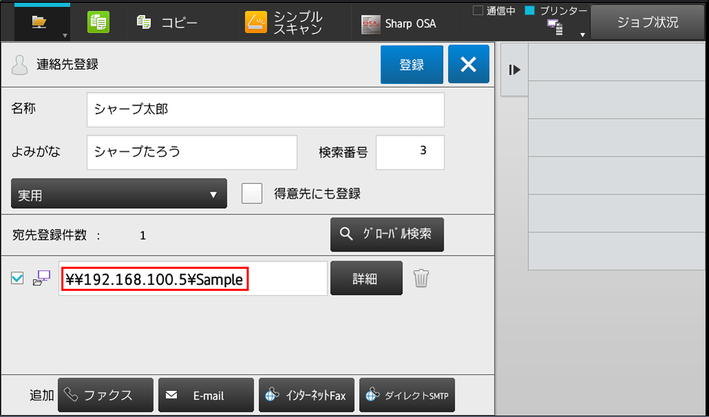 ⑤「連絡先登録」画面が表示されますので、共有フォルダーの宛先欄(例:\\192.168.100.5\Sample)を押して下さい。