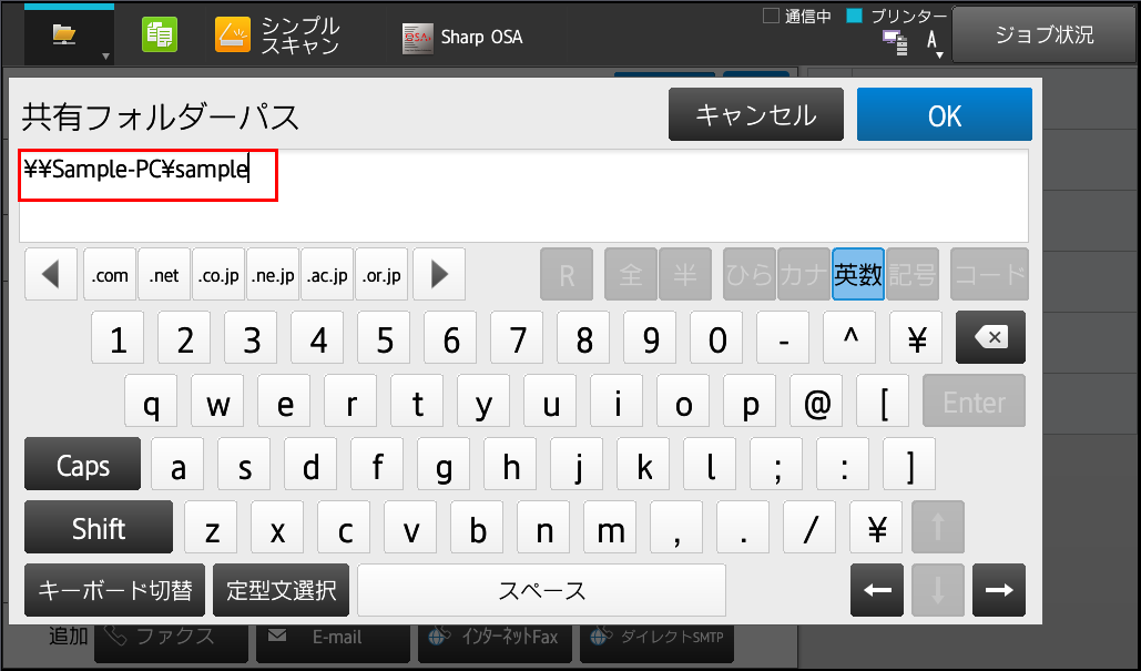 ⑦「共有フォルダーパス」の入力画面が表示されますので、上記で確認したコンピューター名で共有フォルダーパス(\\Sample-PC\Sample)を入力して[OK]を押して下さい。