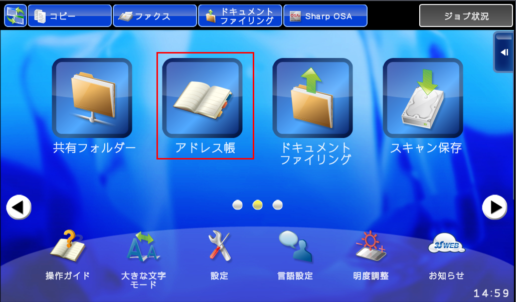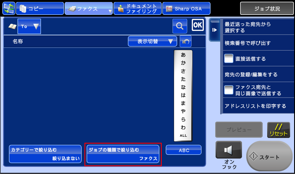②「アドレス帳」画面が表示されますので、[ジョブの種類で絞り込む]を押して下さい。