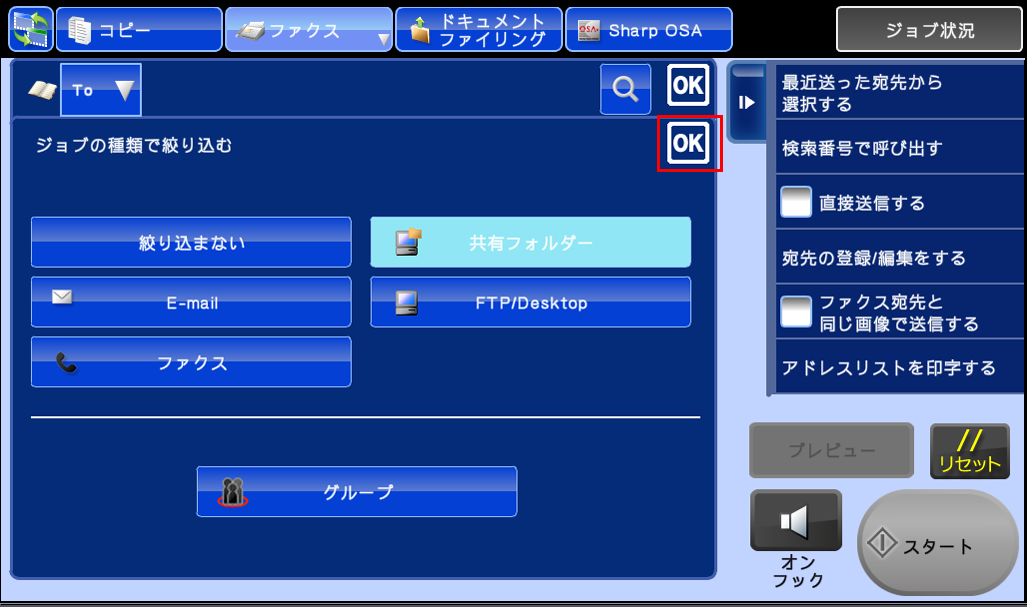 ③「ジョブの種類で絞り込む」画面が表示されますので、[共有フォルダー]を押して[OK]を押して下さい。