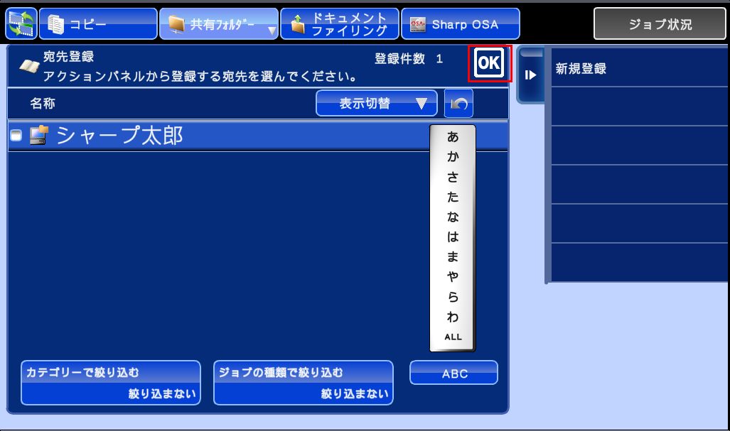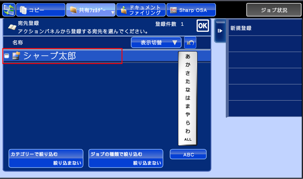 ⑤「宛先登録」画面が表示されますので、一覧から対象の宛先名(例:シャープ太郎)を押して下さい。