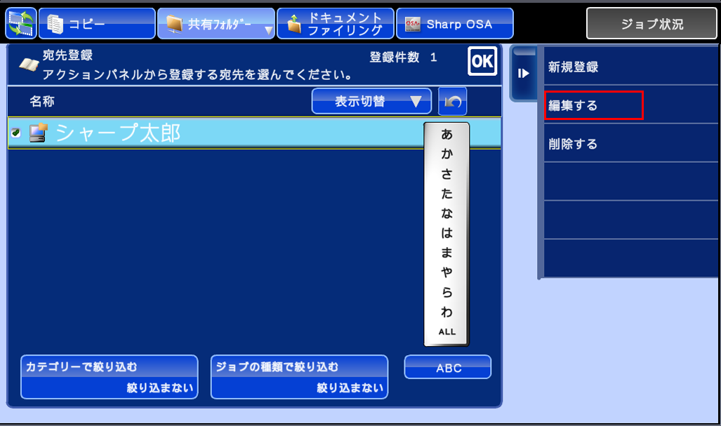 ⑥宛先名(例:シャープ太郎)を選択後、アクションパネルの[編集する]を押して下さい。