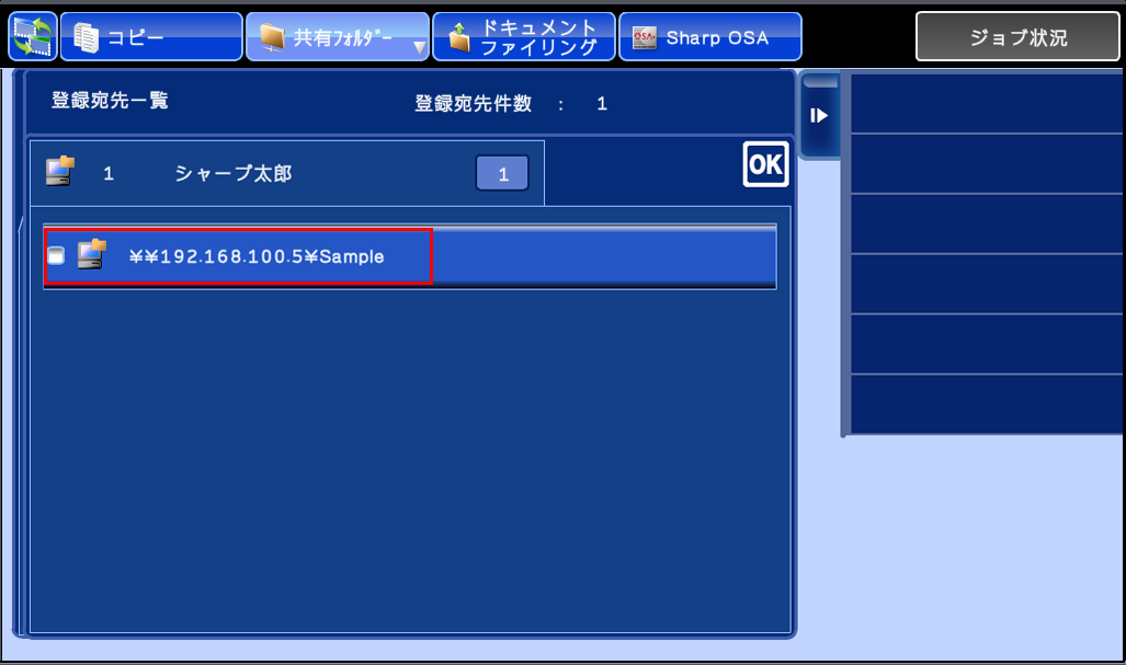 ⑧「登録宛先一覧」画面が表示されますので、対象の[送信先(例:\\192.168.100.5\Sample)]を押して下さい。