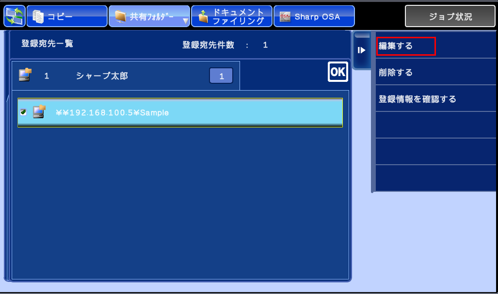 ④「共有フォルダー」の宛先が含まれる送信先一覧が表示されますので、アクションパネルの[宛先の登録/編集をする]を押して下さい。