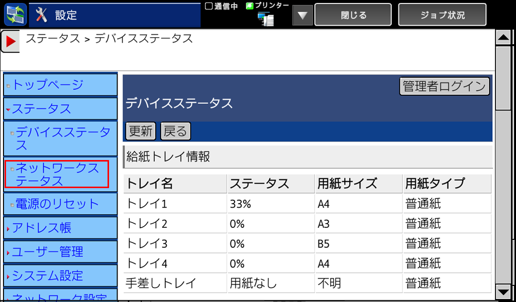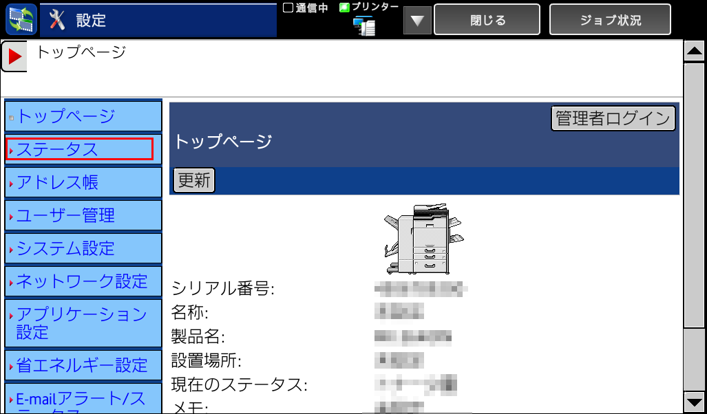 (表示されたWeb管理画面では、複合機の状態確認や設定・変更が可能です。)