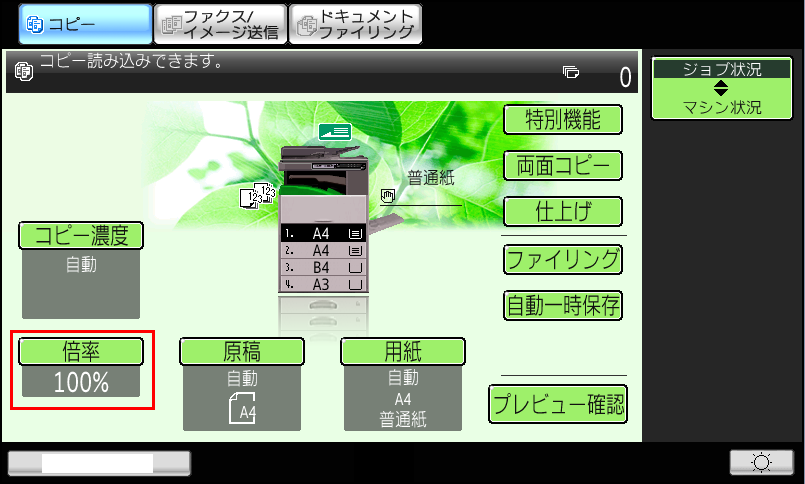 原稿サイズと用紙サイズが決まっている場合、最適な倍率を画面操作で選ぶことができます。また、用紙より少し小さくコピーするなどの微調整も可能です。