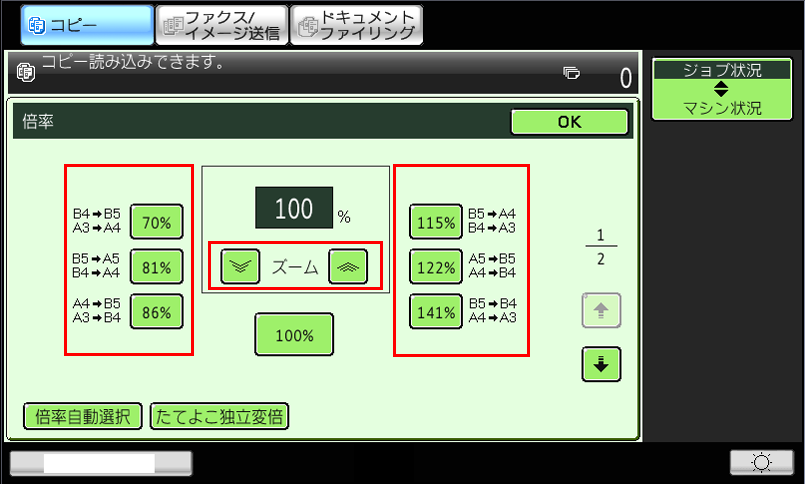 ③「倍率」画面が表示されますので、原稿サイズと用紙サイズに対応した倍率を選択し、[OK]を押してください。