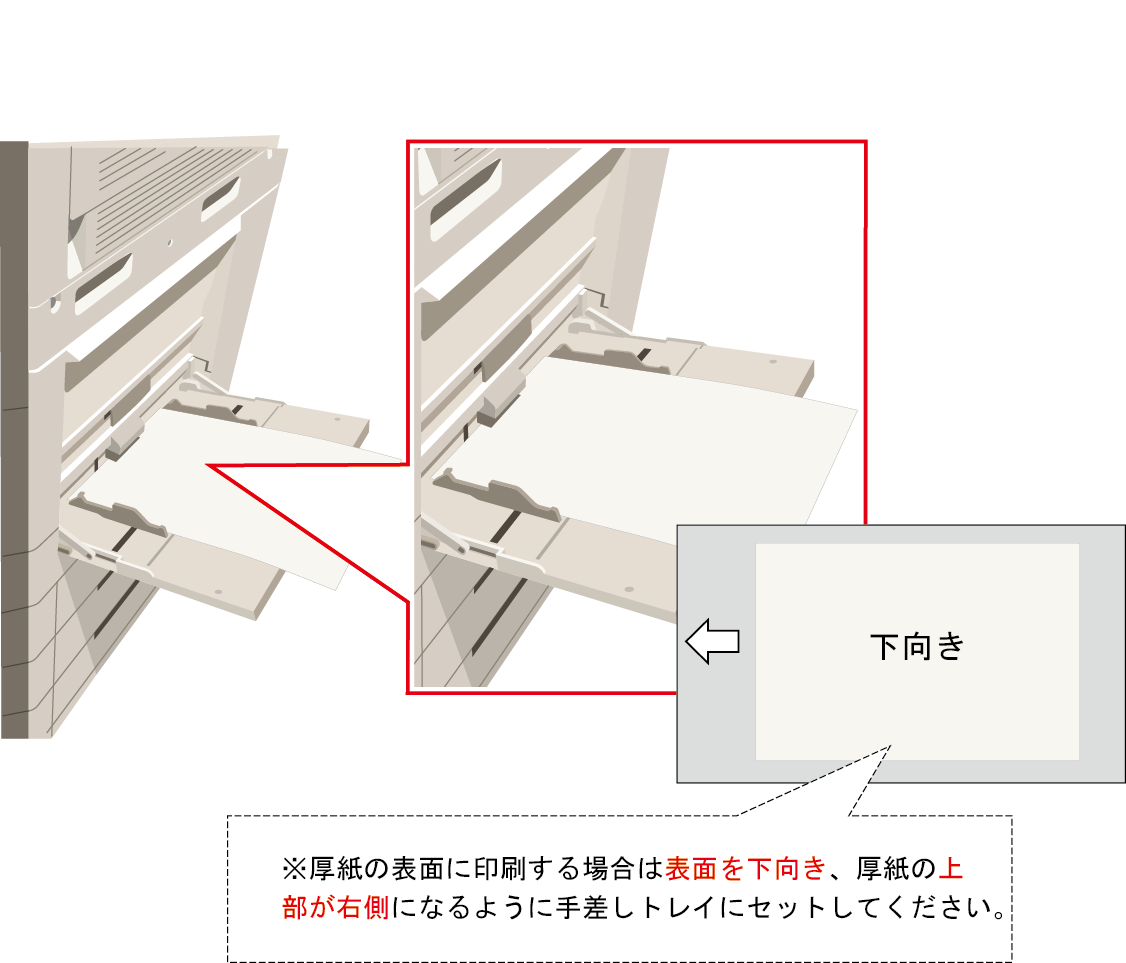 ①「複合機」の手差しトレイに、厚紙をセットしてください。