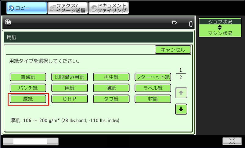厚紙に印刷するには、コピー基本画面の「用紙」画面で用紙タイプを「厚紙」に設定して印刷します。