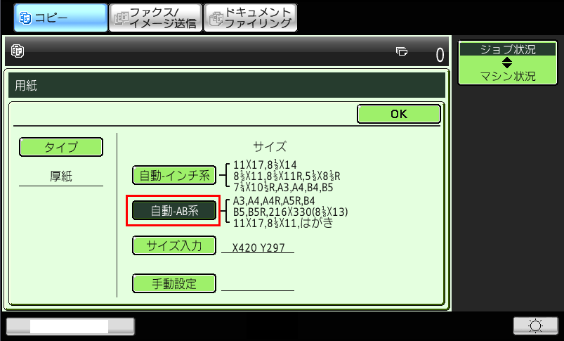 ⑥厚紙の「用紙サイズ」欄で、使用する印刷用紙の種類(例:自動-AB系)を選択後、[OK]を押してください。