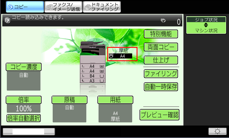 ⑦コピー基本画面で「用紙タイプ」が「厚紙」になっていることを確認してください。