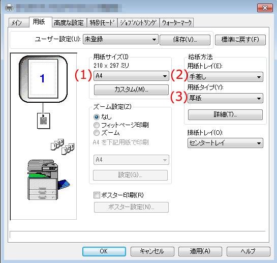 (設定例:用紙サイズ「A4」、用紙タイプ「厚紙」)