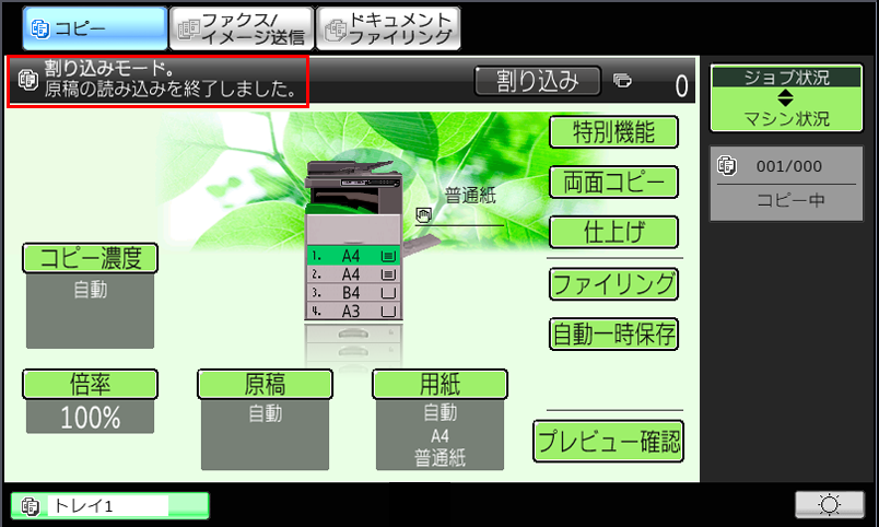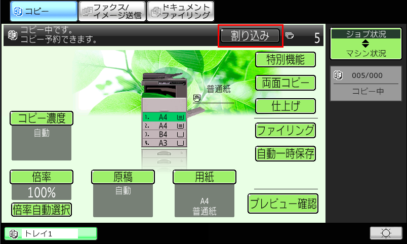 コピー基本画面の[割り込み]を押すと、簡単に割り込みコピーができます。