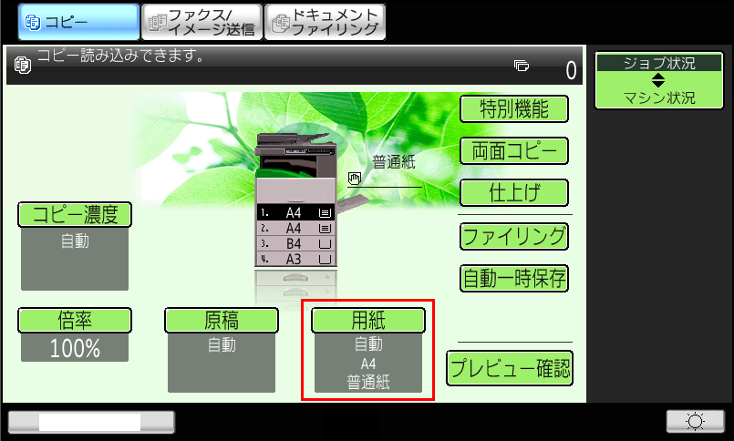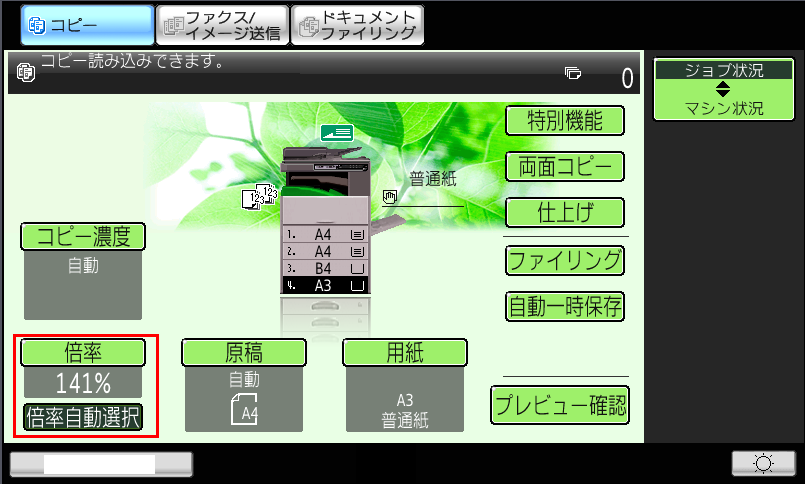 ④コピー操作の基本画面に戻りますので、[倍率自動選択]を押してください。