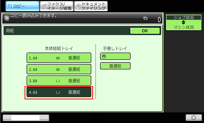 ③「用紙」画面が表示されますので、コピーしたい用紙サイズ(例:4.A3普通紙)を選択し、[OK]を押してください。