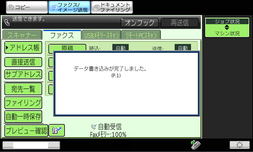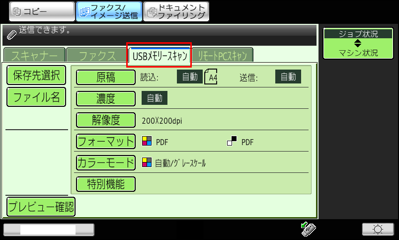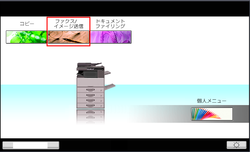 ④「ファクス/イメージ送信」画面が表示されますので、[USBメモリースキャン]タブを押してください。