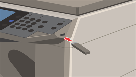 ②USBメモリーを「複合機」のUSB挿入口に差し込んでください。